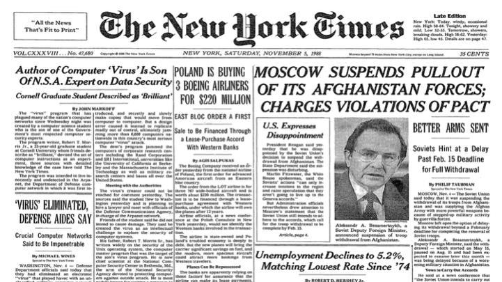 The attack was devastatingly effective. The worm propagated itself onto any system it could successfully log into, and then the process repeated. The incident made front-page news in The New York Times, with a headline declaring "Author of Computer 'Virus' Is Son of N.S.A. Expert on Data Security." The worm infected thousands of systems. While it was not designed to cause harm, it failed to check whether a version of the software was already running on a compromised computer. This caused multiple instances of the software to run concurrently, bringing significant portions of the early Internet to a standstill.