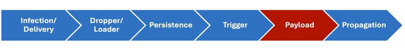 The payload is what the malware actually does: its core malicious functionality. This is where the attacker's objectives are realized. Everything before this stage is set up; the payload is the attack itself.